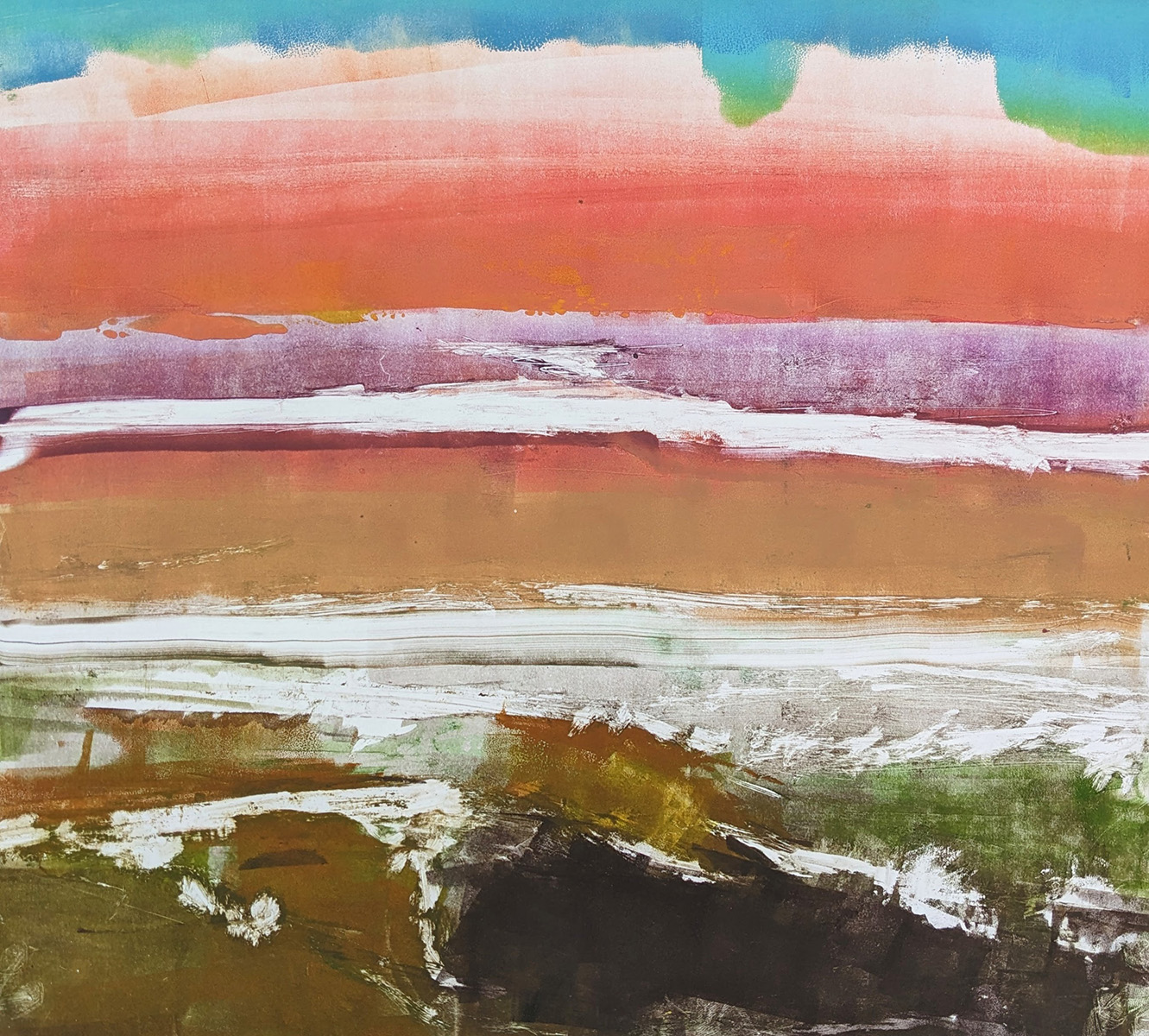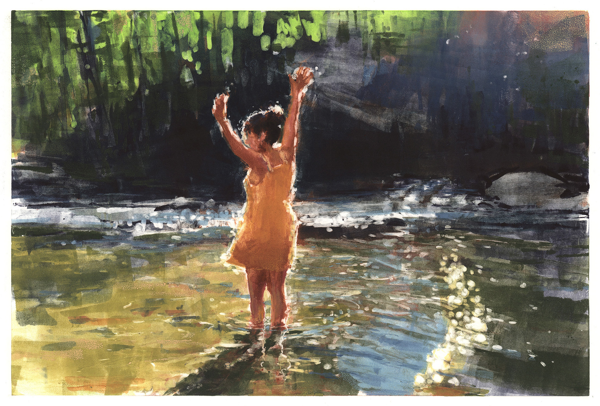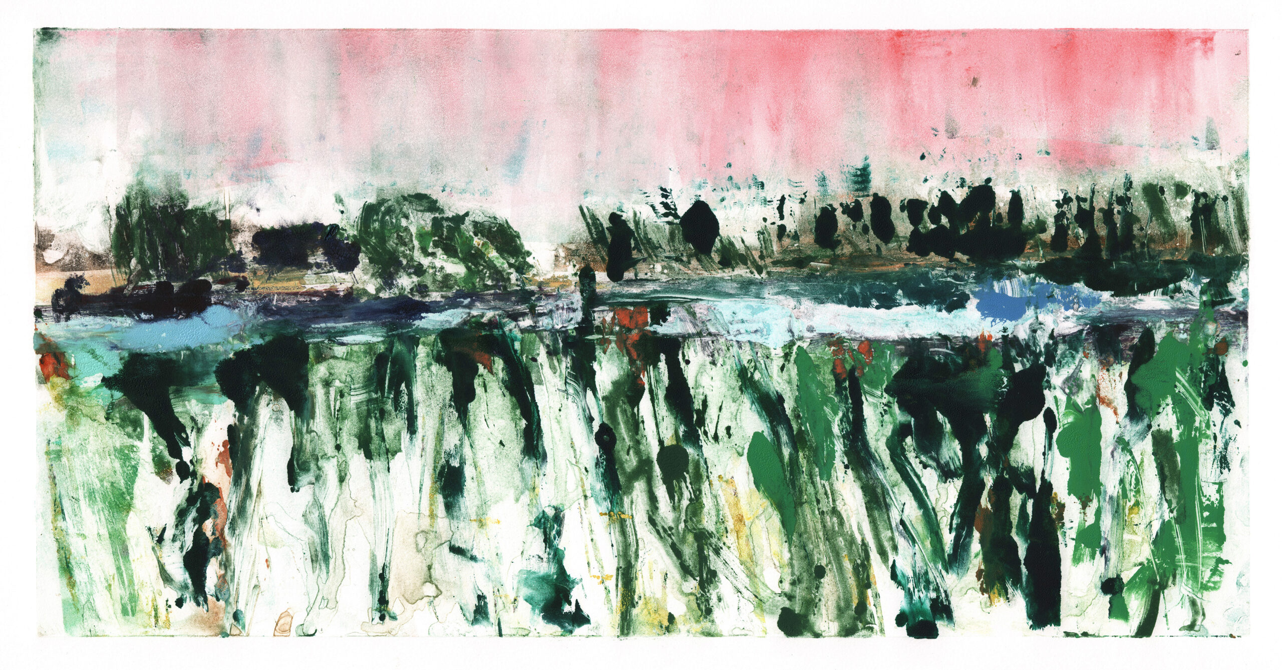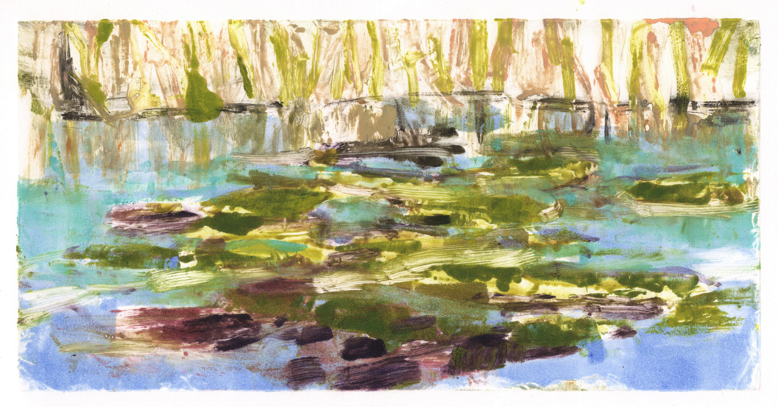 In this two-day workshop we will create monotypes outdoors, inspired by our surroundings at the beautiful Plas Newydd farm. This large family farm located alongside the Lewis River has a diverse landscape, with rolling fields, mature forests, old barns, wild flowers and plenty of watery goodness to draw inspiration from, and a lovely farmhouse for us to take refuge in. Inspiration can take many forms when working in and around nature, and any direction that inspires you will be supported in this workshop, representational or non-representation. We will create one of a kind prints on paper, monotypes, with an emphasis on light, value, impulse, experimentation and joy!